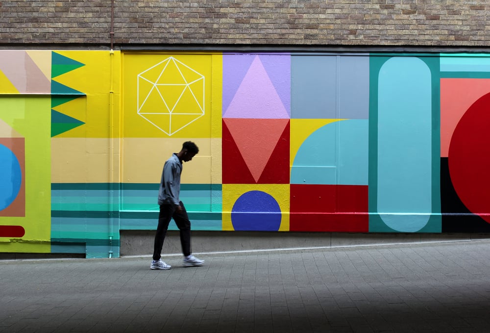 The mural pulses with energy. Bright blues, deep reds, flashes of yellow and violet woven into geometric forms that seem at once organic and mathematical. There are echoes of molecules, of cells under a microscope, of unseen worlds made visible. These patterns speak to the artist’s background in science: molecular biology, microscopy, where beauty often hides in the smallest things.